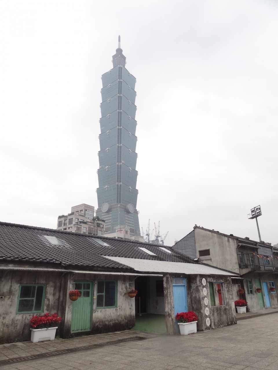 残された日本家屋とは違いコンクリート長屋が連なる感じ(団地みたい)。台北101がよく見えて、近代的なタワーと古い建物のギャップが面白い。