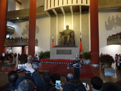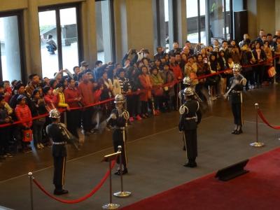 台北で守衛兵交代式が見れるのは国父紀念堂・中正紀念堂・忠烈祠の3か所ですが、ここは2階にあがる階段の途中(踊り場)から交代式を見ることができ、式の様子を唯一上から眺めることができるスポットでした。(大きな柱が視界を阻むので、いい場所を確保したければ式の前に行って陣取ったほうがよさそうです)- 旅行時期