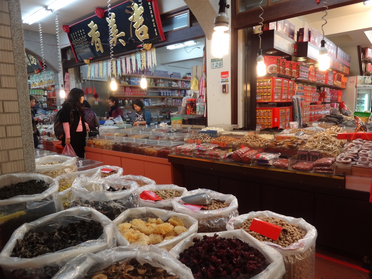 ‘台北の御徒町’と称される事がありますが、生鮮品はなく乾物問屋・漢方薬店が並んでいます。ドライフルーツや花茶、お菓子、棗クコ松の実などの漢方食材、フカヒレ・カラスミ・貝柱・タラ・きくらげ・椎茸などの乾物が溢れています。乾物は1斤600g単位で量り売り、お店や品物によっては半斤からでも購入可。安いのでお土産調達によく利用します。クレジットカードは殆ど使えません。