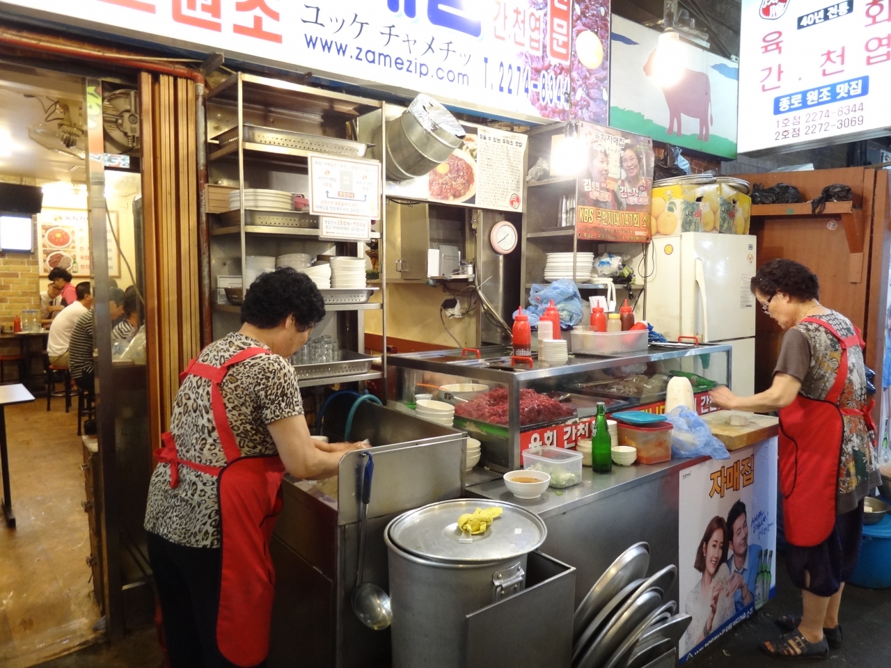 広蔵広場‘ユッケ通り’と呼ばれる細い路地にあるお店。お店の前にユッケ・レバ刺し・カンが並ぶケース、店先でせっせと仕込みをする店員さん。