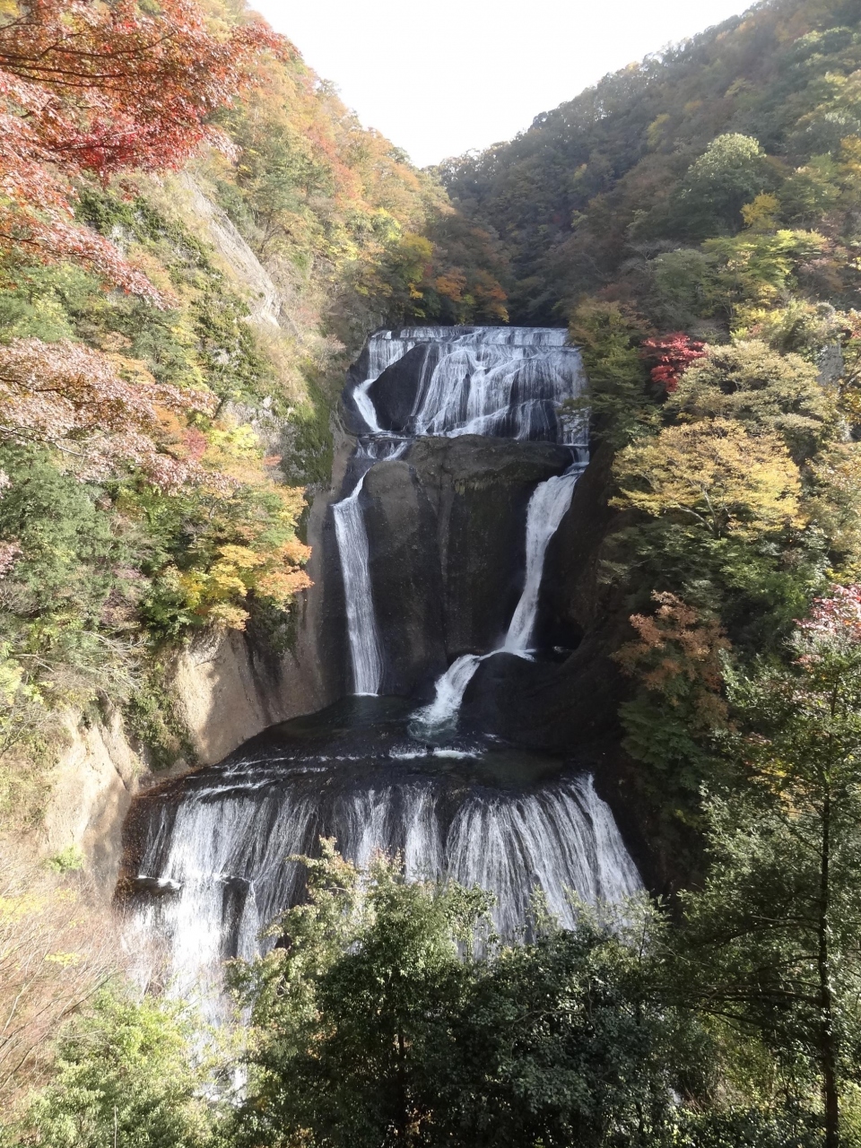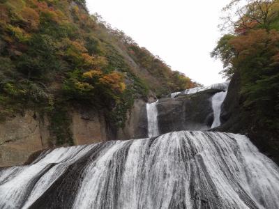 滝を上から一望できる観瀑台へはエレベーターで、展望台のようになっていて眺望がとても良い!袋田の滝の全貌が良くわかります。大きな岩肌を白い糸のように流れる滝は壮大ながらも繊細な印象でした。周囲の山は色づき始め、紅葉見頃間近。あと10日位遅ければ最盛期だったかも。