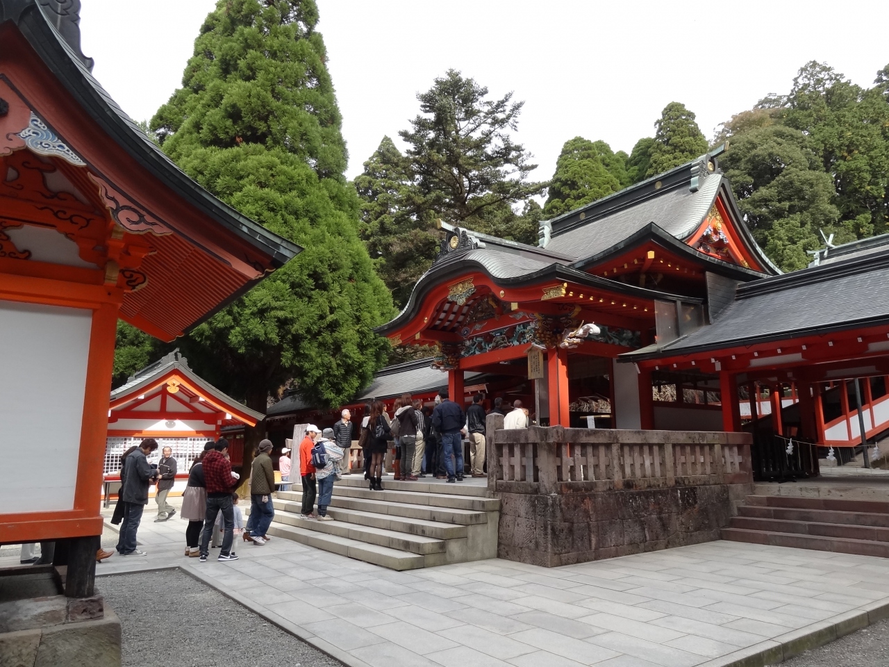噴火により幾度かの移設を経て現在の場所に。1715年に島津藩主・島津吉貴が再建した現在の社殿は重要文化財。朱色が映えとても美しい建物です。装飾も色鮮やかで華麗。