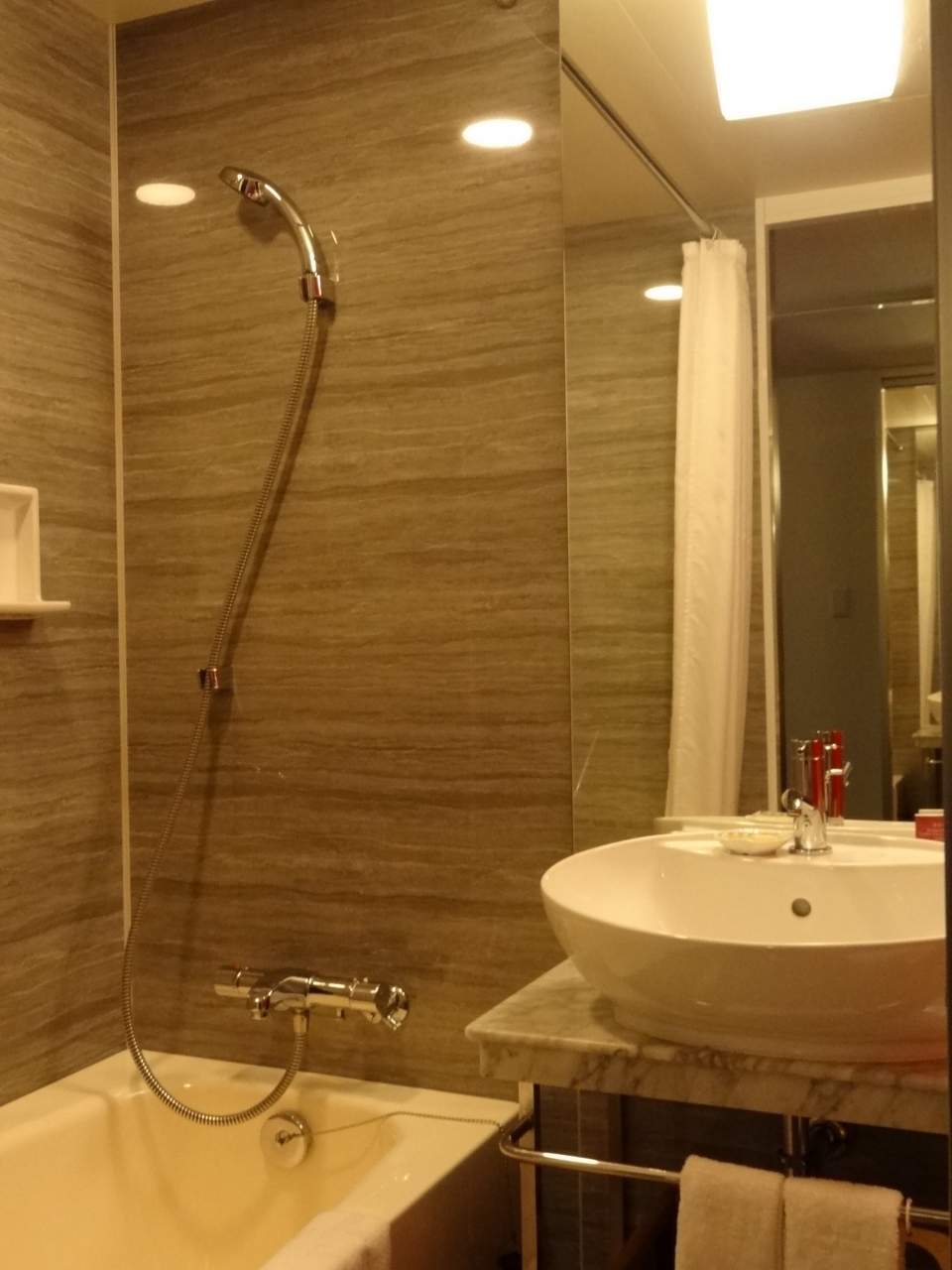 バスタブは足を伸ばせない小さめサイズ、でもバスルーム自体は窮屈な感じはなく、アメニティーもデザイン性高くスタイリッシュ。