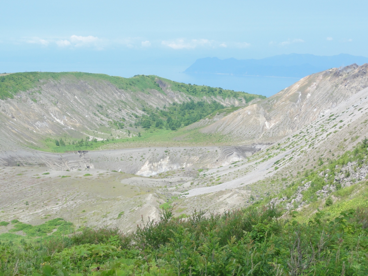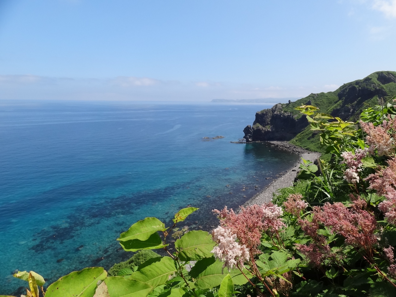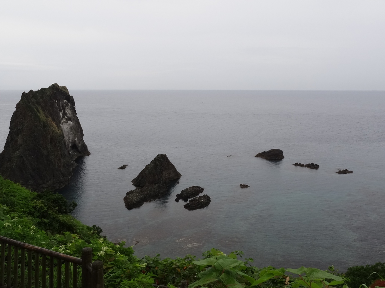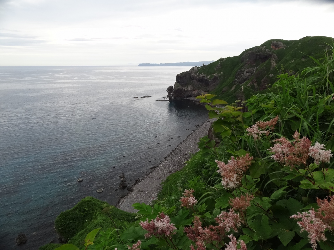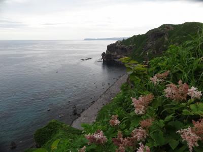 昨年行くのを断念した神威岬、今度こそ‥しかし曇天、海は灰色‥。せっかく来たからと女人禁制の門をくぐり遊歩道を進む、下り道。すれ違う人はは皆ゼイゼイ息切れ‥先端まで結構な距離「帰りはずっと登りかぁ、キツソウだなあ」。半分ほど進んだところで突然の強風と雨、徐々に雨足強くなりスコール状態に。ずぶ濡れになってしまい引き返しました。天気が悪く残念でしたが、遊歩道脇に咲く野趣あふれる花々が綺麗で印象的でした。