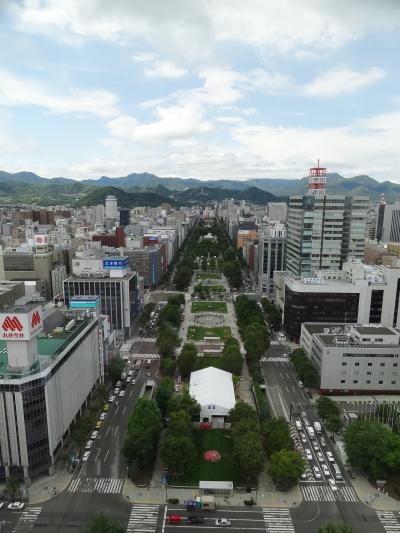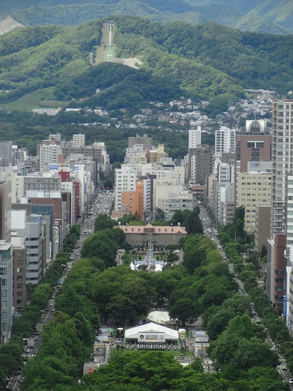 眼下に広がるさっぽろの町。特に西側の景色は「これぞ札幌」って感じで、ビルの立ち並ぶ街の中を真っ直ぐ貫く緑の大通公園が眼下に、その向こうに大倉山ジャンプ場や藻岩山が見えます。