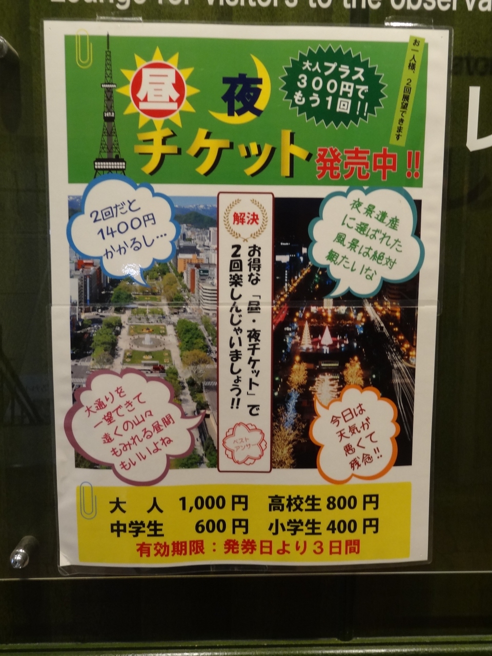さっぽろテレビ塔 大人700円、昼夜チケットは大人1,000円。- 旅行時期