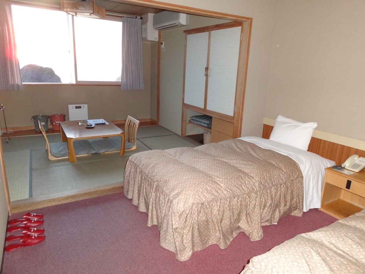 3階355号室に一人で宿泊。シングルベッド2台と6畳の和室がある和洋室、オホーツク海に面した部屋でウトロ湾を見下ろす眺望。くつろげます。トイレと小さな洗面所あり。お風呂は大浴場利用になりますが、24時間利用可の天然温泉かけ流し!小さな露天風呂もあります。