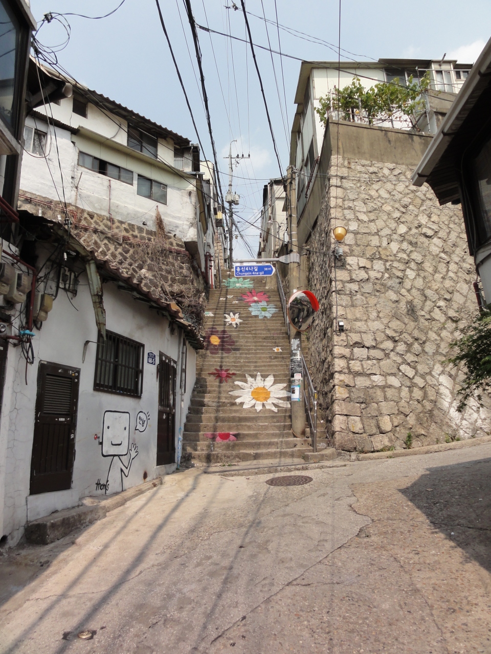 地下鉄4号線‘恵化駅’東にある駱山(駱山公園)、その南側山麓の住宅街一帯に‘恵花洞路上美術館’があります。いわゆる美術館(建物)はありません、道路や階段・壁にいろいろ絵が描かれていたり、オブジェがあったり‥街がアートと調和して美術館のようになっている所で、散策がとても楽しかったです。坂・階段が多いので、思った以上にいい運動にもなりました。