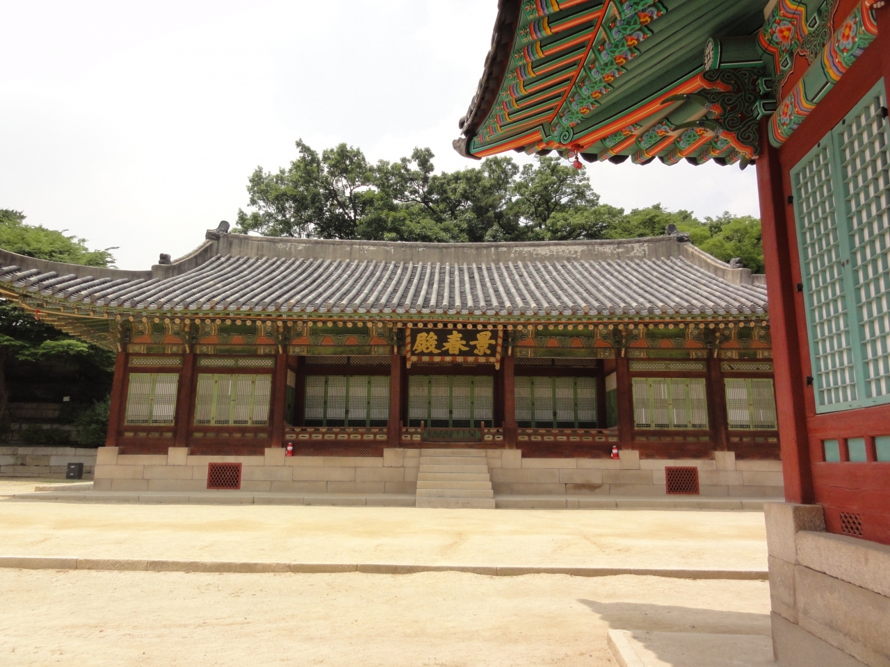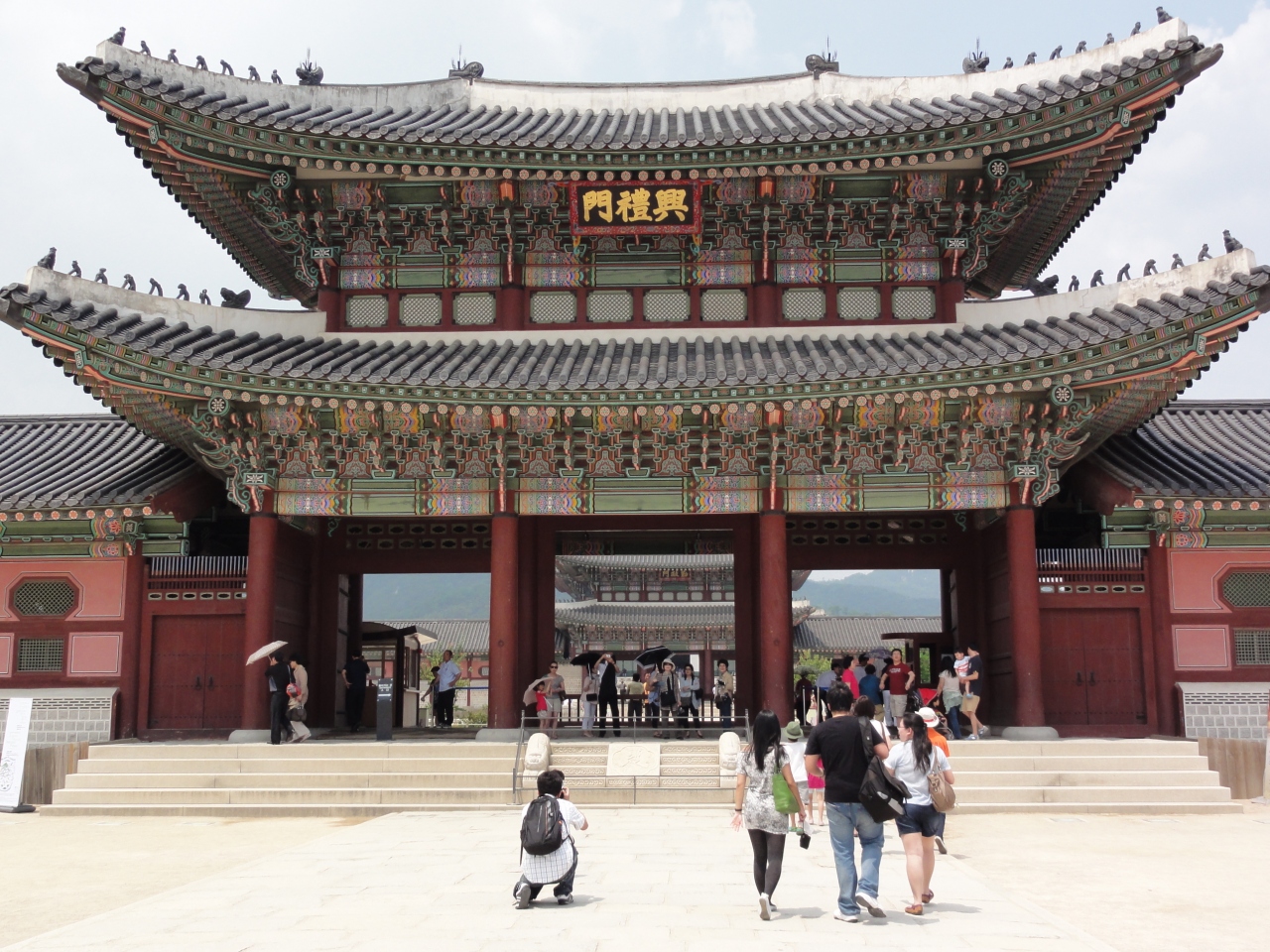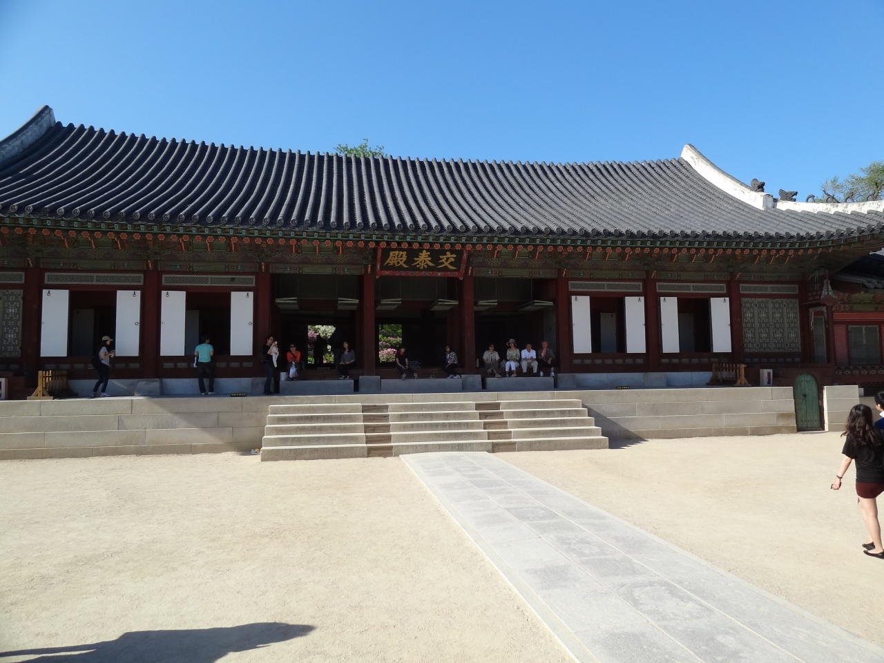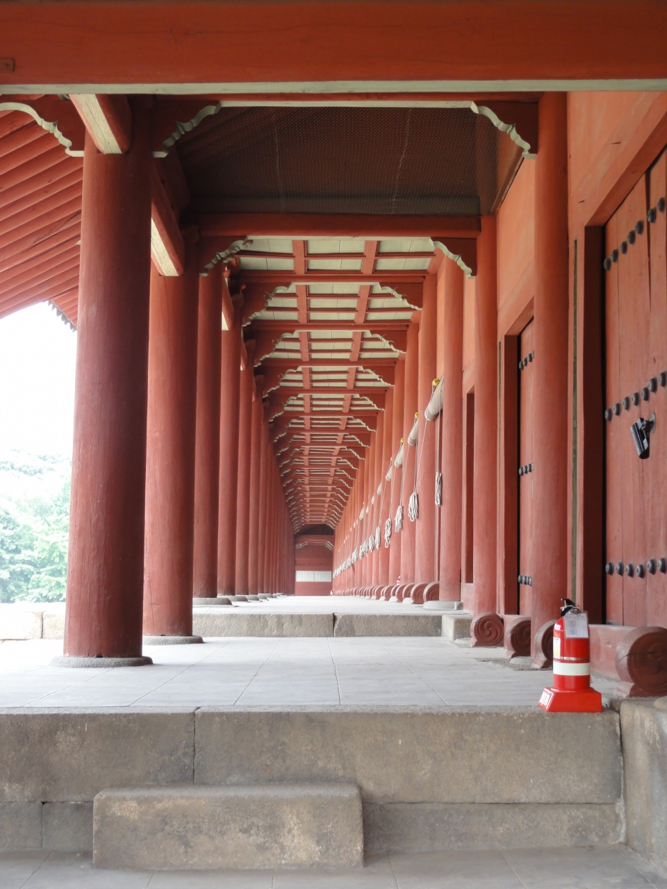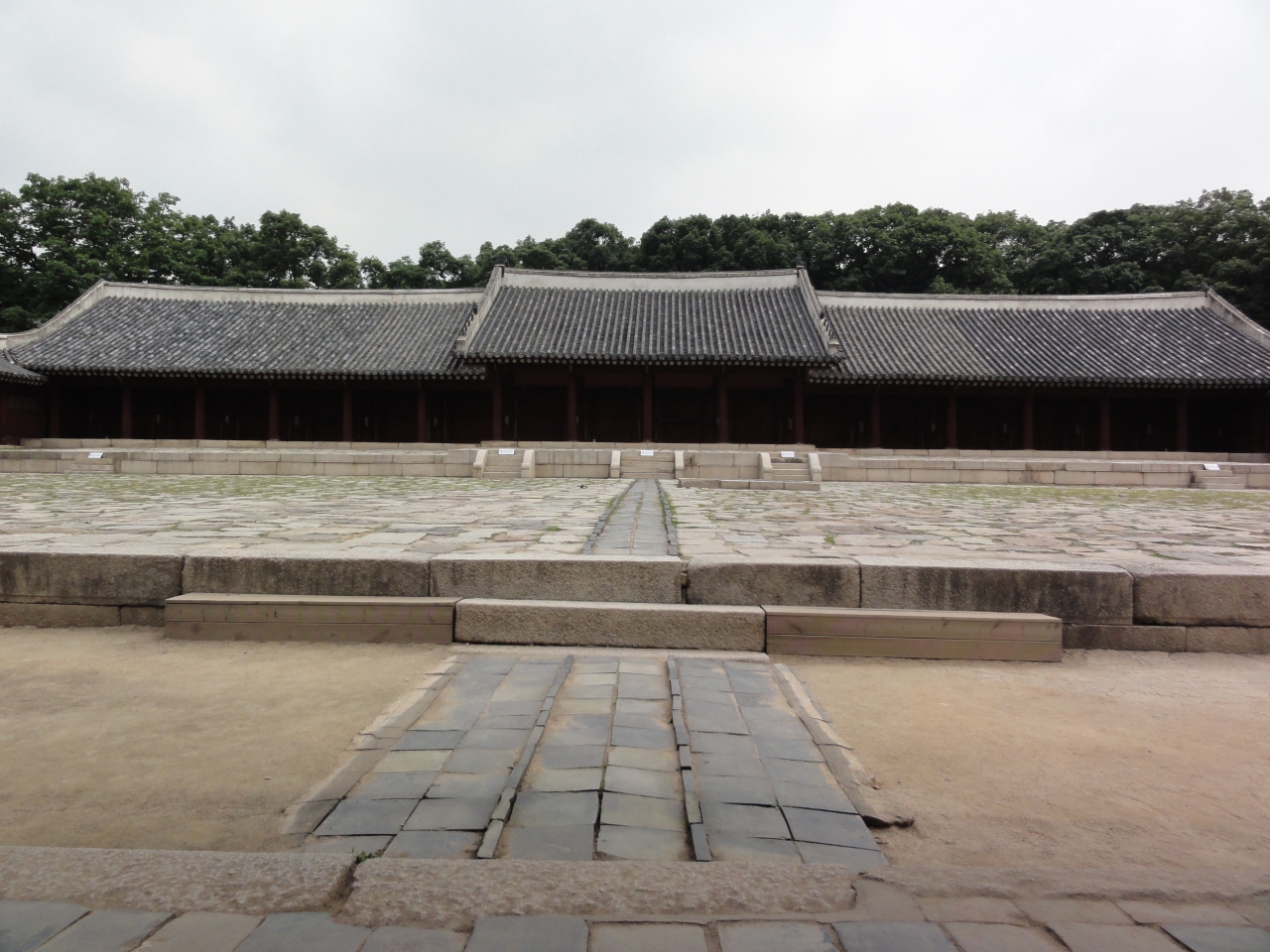 最初は7代まで遡り王と王妃の神位(位牌)を安置し時期を過ぎれば永寧殿に移したそうです。李朝中期から現在の安置方法に変わり、位牌が増えるにつれて正殿の規模も大きくなり、その結果‘単一木造建築物で世界最長’になりました。(東西の幅101m)現在安置されているのは王19人、王妃30人。位牌を保管する部屋19間が中央、両脇にそれぞれ部屋2間、直角に曲がる楼閣を立てた建物。儒教思想に基づく独特の建築様式は整然としていて荘厳、王宮とはまた違う重厚感がありました。- 旅行時期