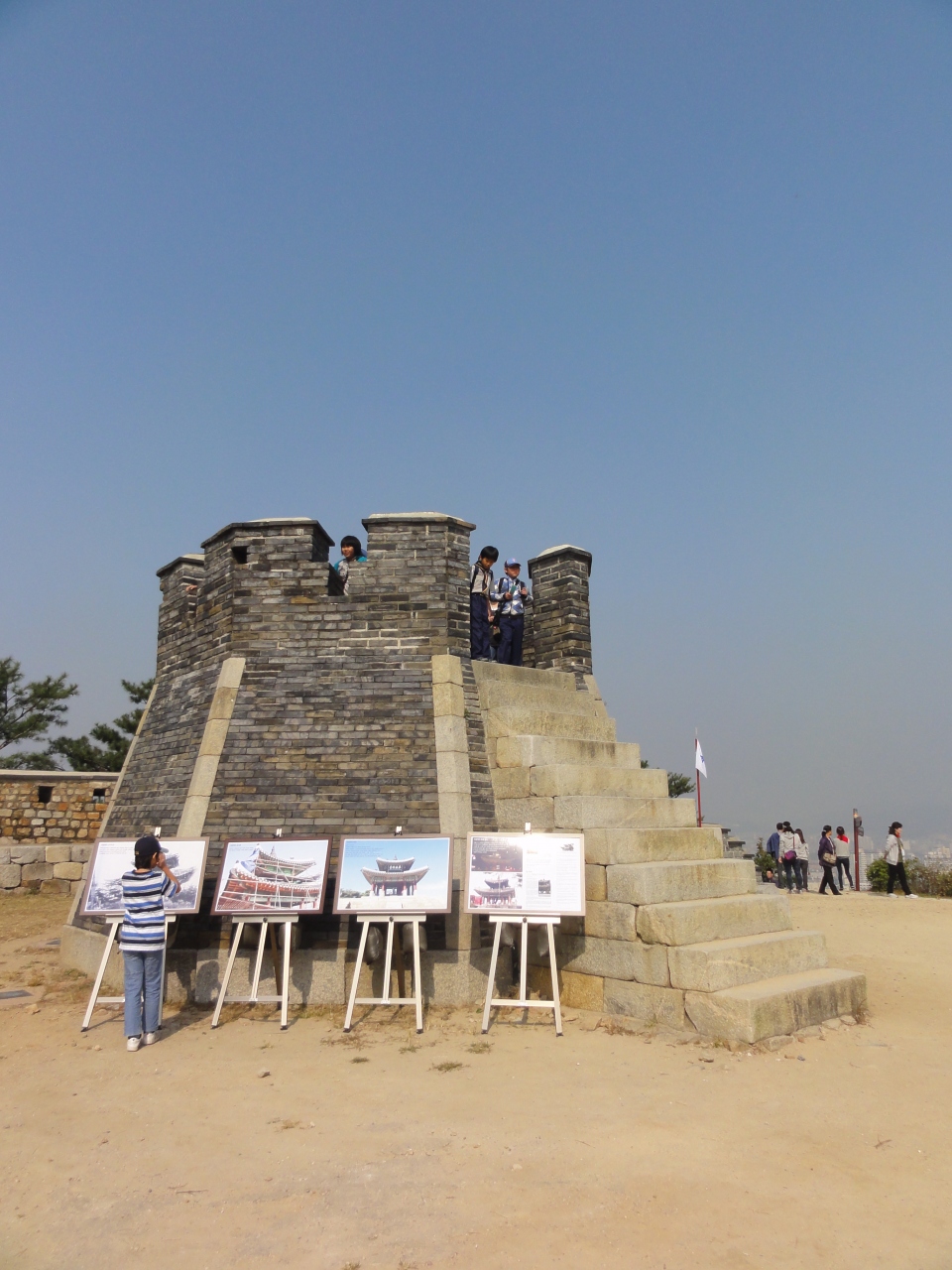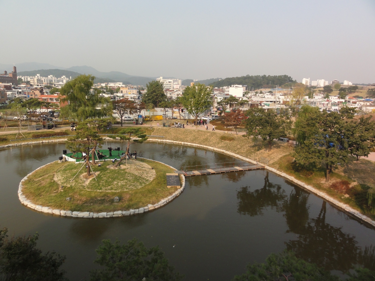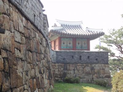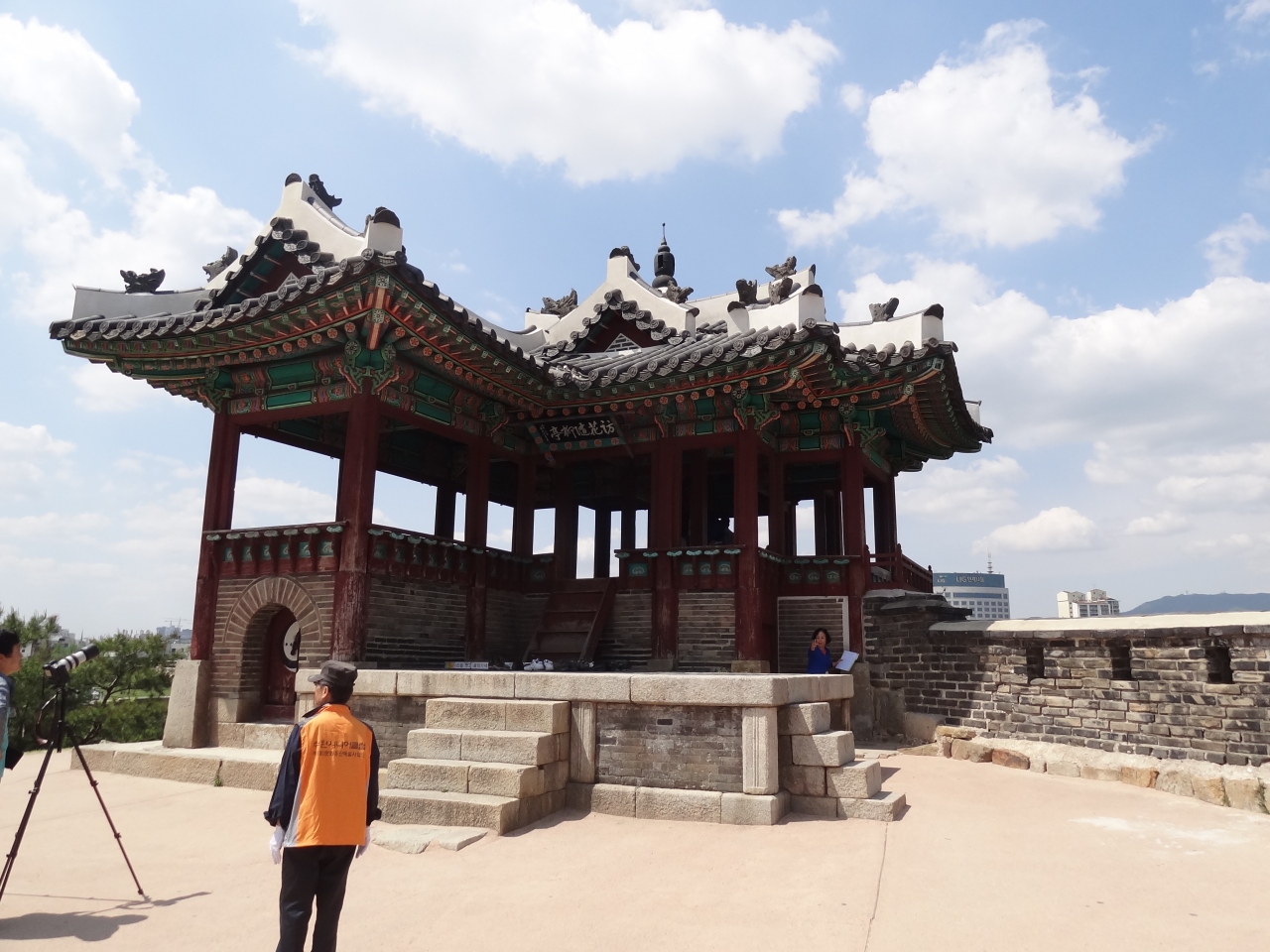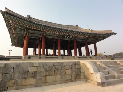 水原華城の東北角楼、華虹門の近く小高い場所にある亭。幾何学的な少し変わった形をしていて、中に入って休むことができます。楼閣の下には龍淵という池があり庭園のようになっていて優雅な眺め、風がとても気持ち良かったです。