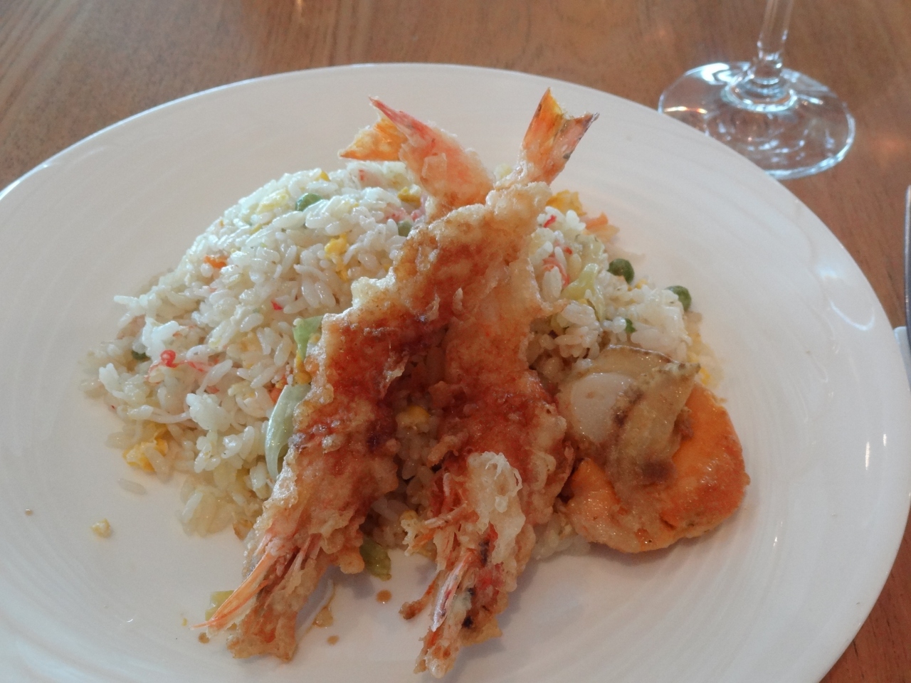 イーフビーチホテル1階、プールサイドとイーフビーチが見える解放感あるレストラン。突然の大雨強風に見舞われてしまったので、こちらで雨宿りも兼ねランチ。久米島は車海老の養殖が有名(日本一?)で、特産の車海老を使ったメニューがありました。車海老チャーハンをオーダー。有頭車海老のフライがドーンとのったチャーハン、車海老の頭がとても美味しかった(ミソが濃厚)。1,200円はちょっと高いかも。