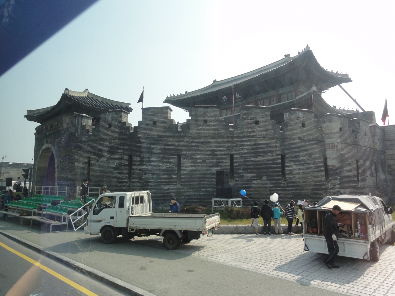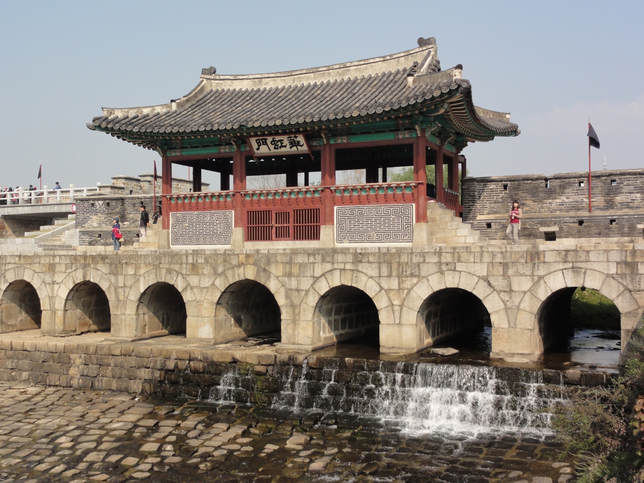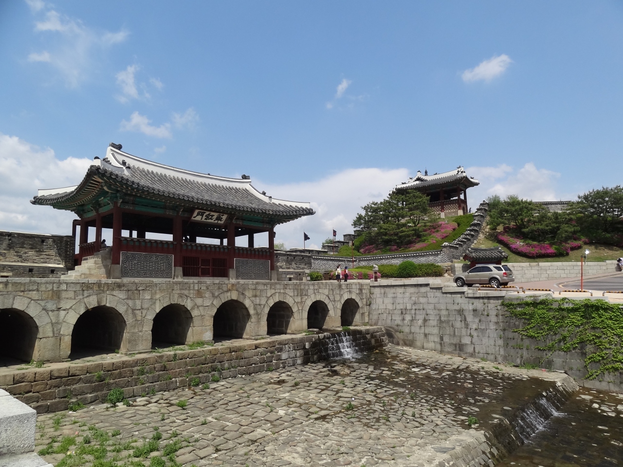 水原華城の‘北水門’。水原川の上に立てられた楼閣と、楼閣下にある7つのアーチ型の門を川が流れる水門が特徴。水しぶきがあがると虹が現れるためこの名が付けられたそうです。だけど訪問した時は水量が少なすぎ‥やや迫力にも欠けました。水原八景の1つ、華城で観ておくべき風景です。