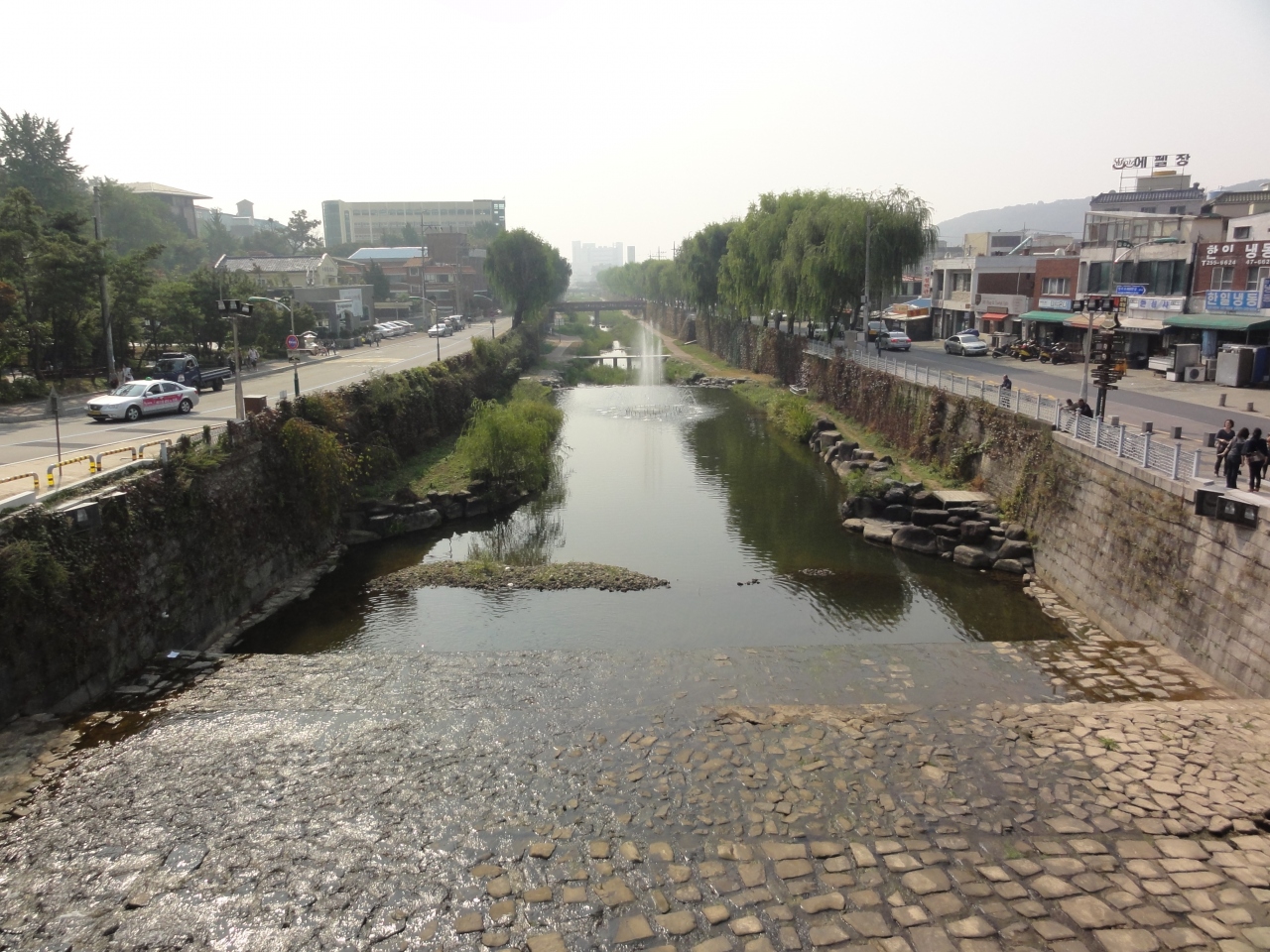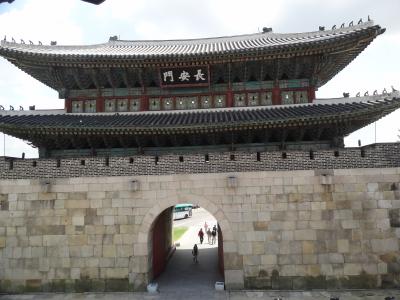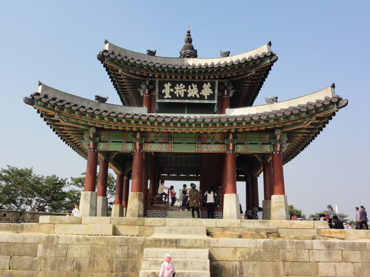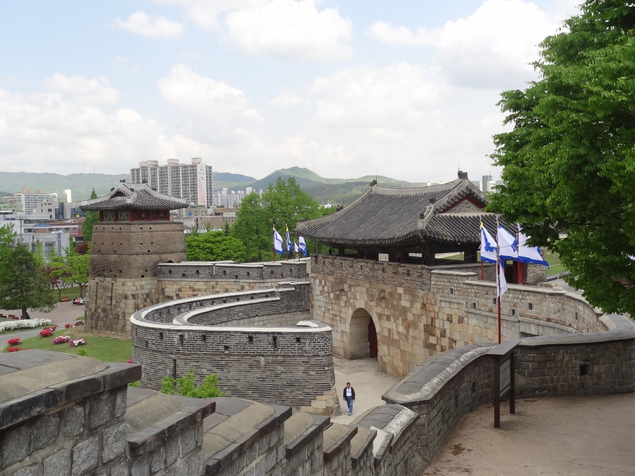 水原華城の‘北水門’。水原川の上に立てられた楼閣と、楼閣下にある7つのアーチ型の門を川が流れる水門が特徴。水しぶきがあがると虹が現れるためこの名が付けられたそうです。だけど訪問した時は水量が少なすぎ‥やや迫力にも欠けました。水原八景の1つ、華城で観ておくべき風景です。