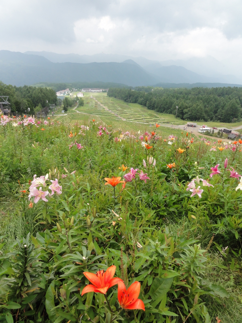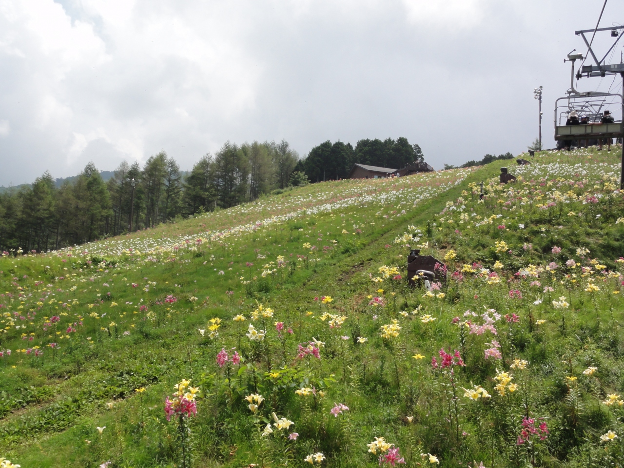リフトはちょっと「高くない?」と感じさせるお値段でしたが、上まで歩いていくのも疲れるし‥乗りました。ゆっくり登って行くリフト、色とりどりの百合の花が斜面いっぱいに広がる景色、綺麗。時々百合の花の香りが、高原の風も気持ちいい。