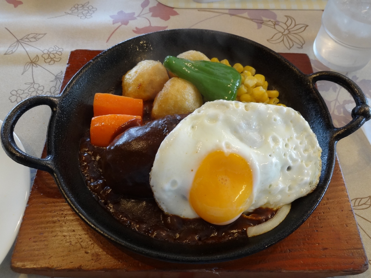 頼んだランチセットがあまり待たずにきました。‘ミニ’なはずだけど結構なボリューム!肉汁がジュワ―っと、油は意外にさっぱり、お肉の味がしっかりしてる。デミグラスソースと半熟の目玉焼き、ハンバーグに絡めて‥こんなに美味しいもの食べられて幸せ。超人気店なのは納得。- 旅行時期