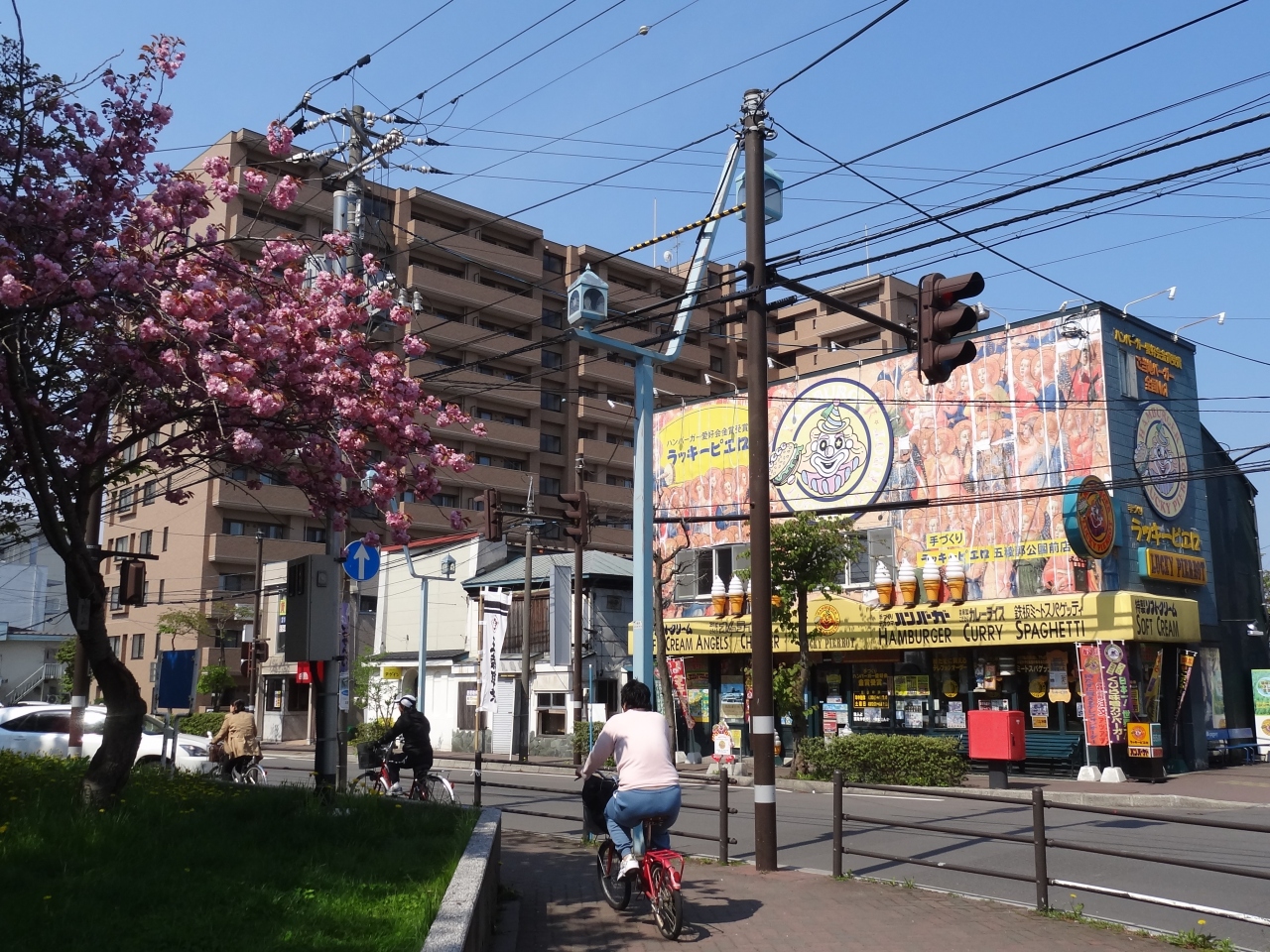 函館駅前から湯の川行きに乗車すると市電は大きくカーブ、曲がるとすぐ隣駅‘松風町’。市電は約90度大きく曲がる交差点が4箇所あり、この松風町交差点はその中のひとつ。函館駅行き空港バスで漁火通りから駅前通りに入ると突然路面電車が現れるのがこの交差点。松風町は商店や飲食店が集まる繁華街で便利です。
