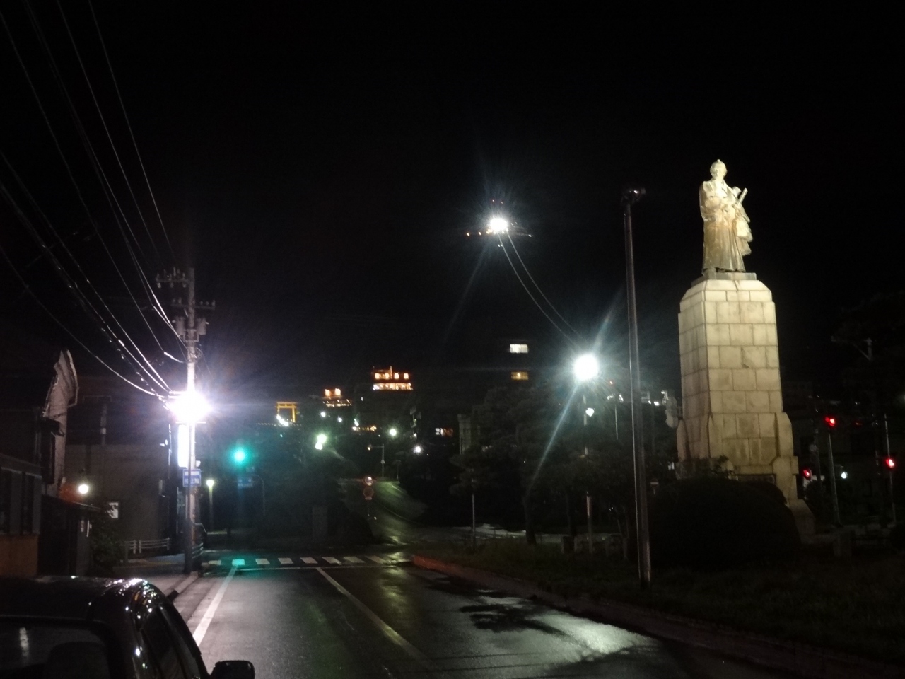 市電‘宝来町’は高田屋嘉兵衛像のある護国神社坂にもっとも近い駅。護国神社坂は幅広の大きな坂で赤い大きな鳥居が坂の上に見えます。