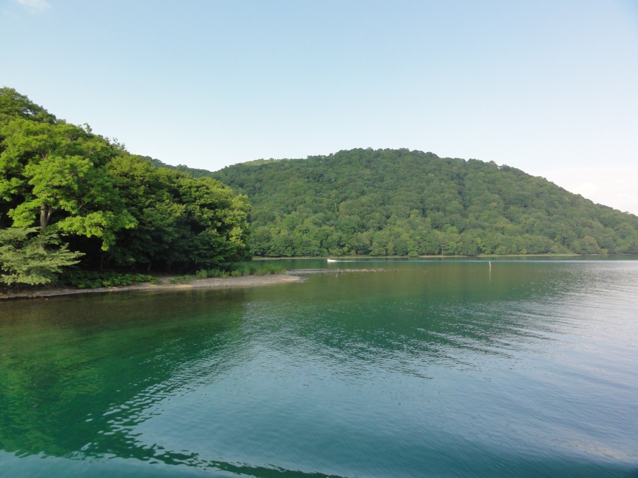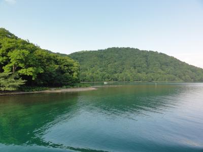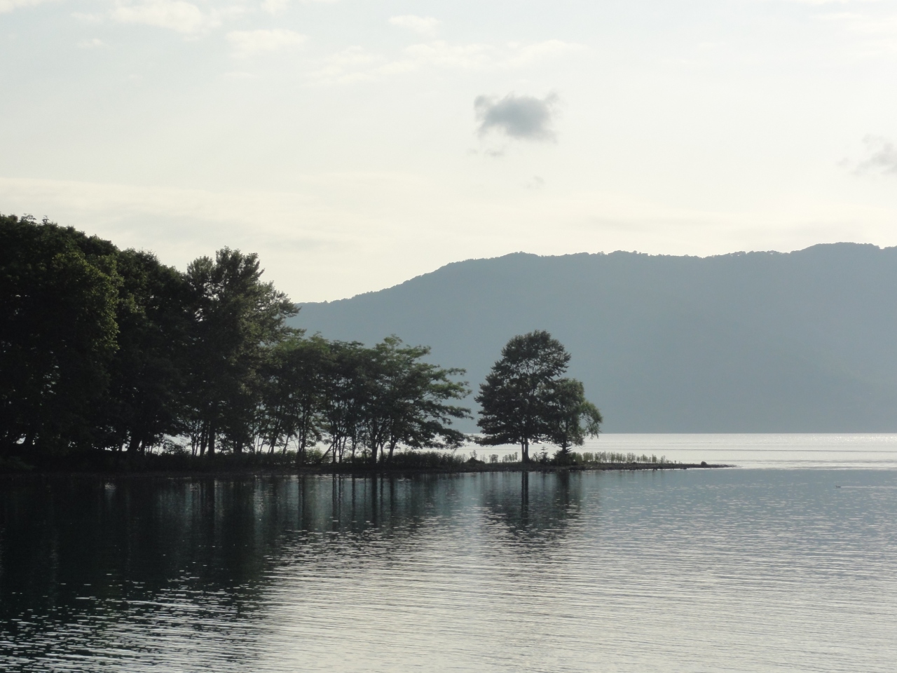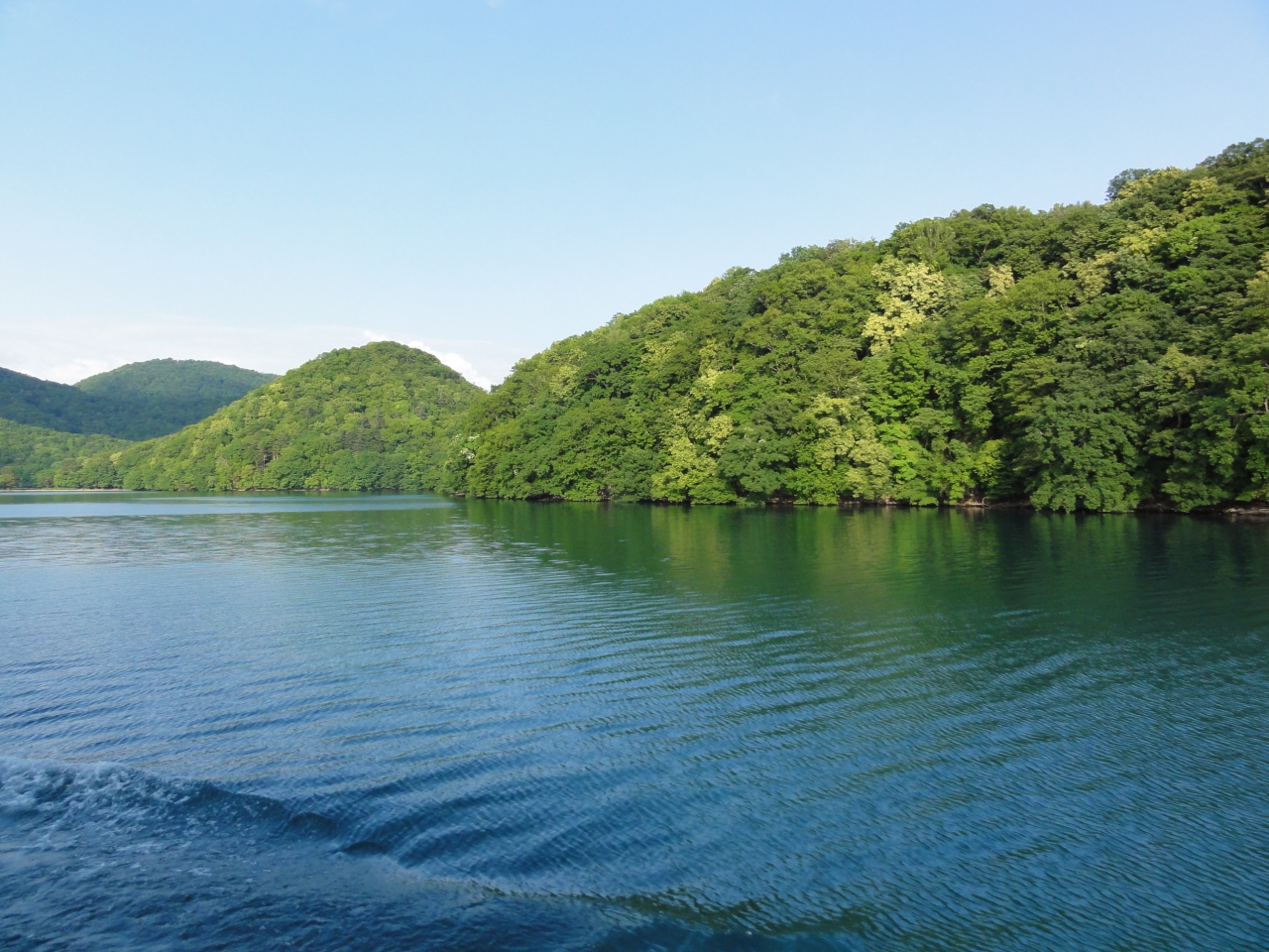 大島に接岸、中島を散策してきたお客さんが沢山のりこんできました。船着き場付近は少し緑色がかった湖面、波の立たない所は木々の緑が湖面に映りこんでこれまた綺麗でした。