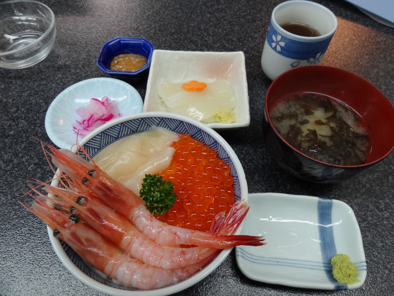 ツアーについていたクーポンを使い切るのに行きました。3種類の海鮮を選べる海鮮丼、イクラ、ホタテ、甘海老を選びました。どんぶり自体はあまり大きくなく、丁度いい量。美味しい‥!サービスでイカ刺付、これも甘くてすごく美味しい!「寒くないですか?」「お味はどうですか?」「お味噌汁のお替りはいかかですか?」「どちらから?観光ですか?」などと一人の私にお店の女性が声をかけてくれました。優しいです。美味しい海鮮丼とお店の人の気遣いに、お腹も心も満たされました。