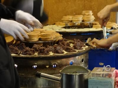 市場のなかに行列が、‘晴光紅豆餅’台湾の大判焼き?皮は薄目でパリっとしてます。中にはたっぷりの小豆餡!甘み少なく小豆そのものの味が良くわかります。美味しいです。甘党の私は「もう少し甘くてもいいかな」と思いましたが、主人はすごく気にいり10個も大人買いして(といっても1個10元)日本に持ち帰りました。- 旅行時期