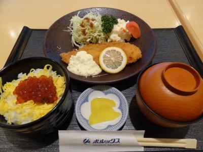 日替わり‘ポルックスランチ’を頂きました。揚げたて熱々の大きな鮭フライにイクラ丼、小鉢・味噌汁、コーヒー付で1,000円。ランチの値段としては安くはないけれど、ボリュームあり、美味しかったので満足です。- 旅行時期