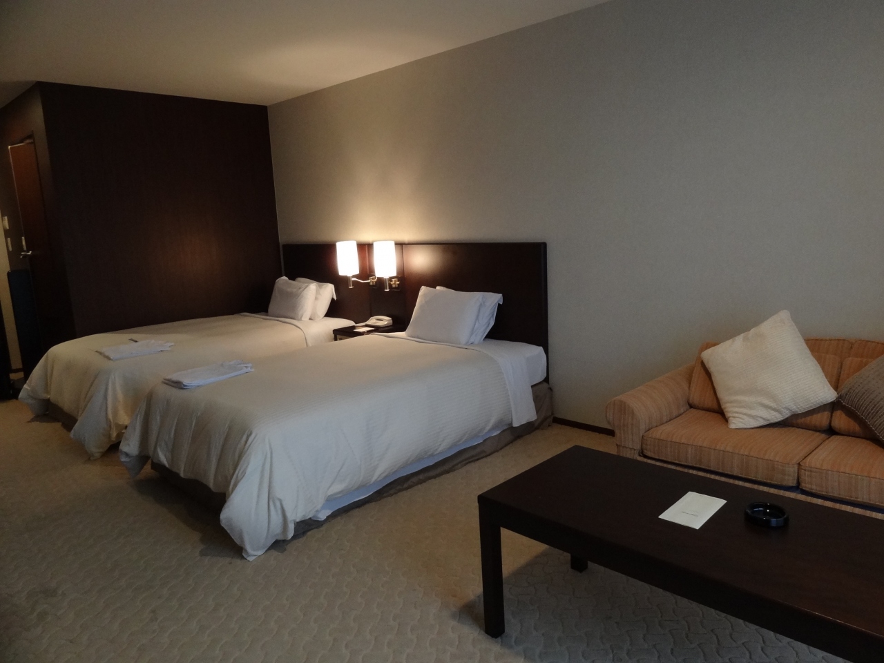 デラックスツイン317号室。ゆとりのある広さ、照明が少なくちょっと暗いかも。ダークブラウンを基調としたシックで落ち着く部屋。