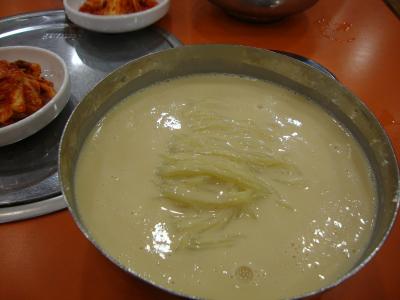 濃厚なドロリとした豆乳の中に、コシの強く喉ごしのとても良い麺‥見た目ほど大豆臭さはなかった。麺に少し味はついていますが殆ど味はないので、塩を入れて自分で味付け。はじめはとても美味しく頂けたのですが、麺が結構多くて‥正直飽きる。付け合せのキムチをいれたりして味を変えてみても‥やっぱり味に飽きてしまいコンクッスは完食できませんでした。数人でシェアしたほうがいいです。