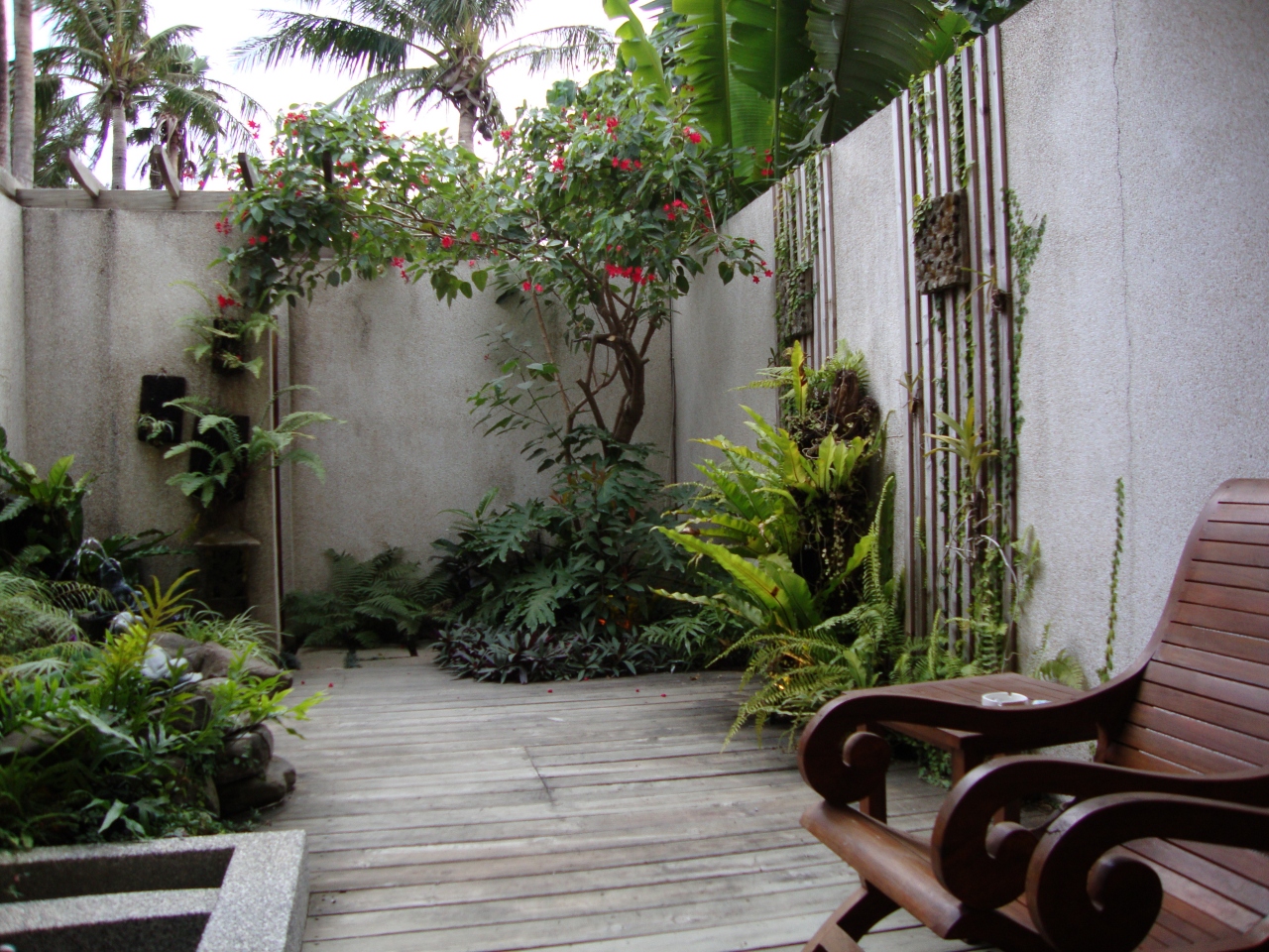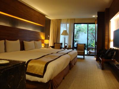滞在したのはジャグジーヴィラ・プールビュー。ホテルの1階で小さな庭付き。庭はバリテイスト、露天風呂(ジャグジーでバラの入浴剤付)デッキチェアーが2つ。風のサワサワいう音を聞きながらくつろげるスペース。広くはありませんが解放感あって凄く良かった。庭には直接プールへ続く出入口が、ヤシの木に囲まれた南国情緒いっぱいのプールきれい。日常を忘れリゾート気分を満喫、ゆっくりできます。