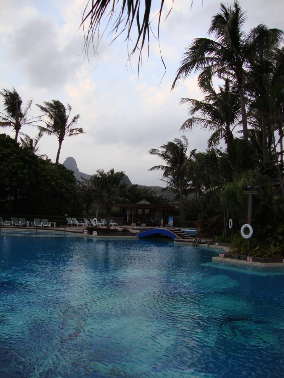 青年活動中心は宿泊施設、中国風建物が珍しかったので、ちょっと見学させてもらってからスタート。黒い岩の向こうに海、弧を描くような白い砂浜の南灣海水浴場が遠くに見えました。地球の歩き方には入場料50元を書いてありましたが、支払するところはなく‥(タダでした)。
