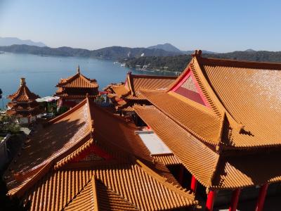 屋上展望台あり、文武廟の屋根越しに日月潭が臨めます。