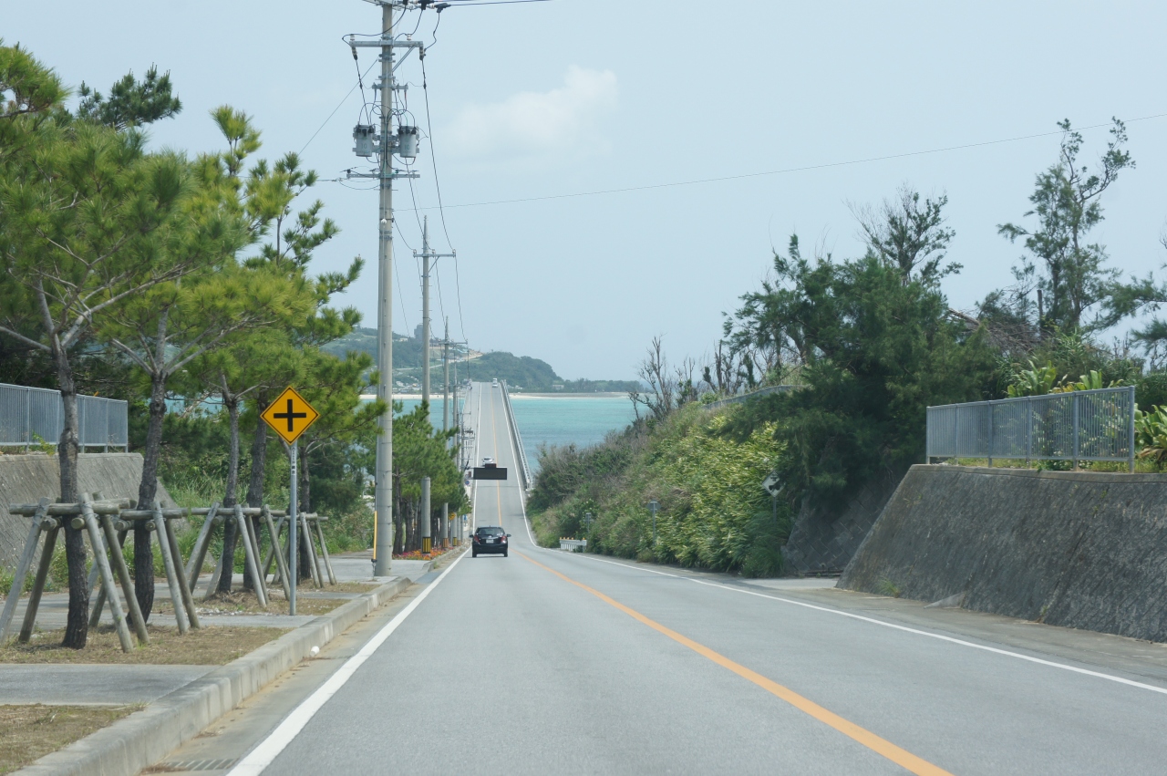 ロードスタータイプのレンタカーで、わるみ大橋を渡り、古宇利島大橋へ。