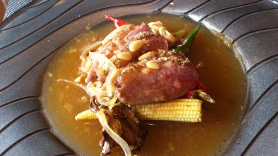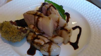 前菜の焼き豚は、紅イモを食べて育ったとのこと。