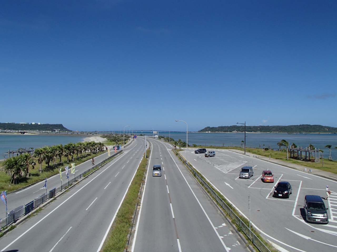 海中道路を走ると両サイドに青くきれいな海が広がるので、癒されます。
