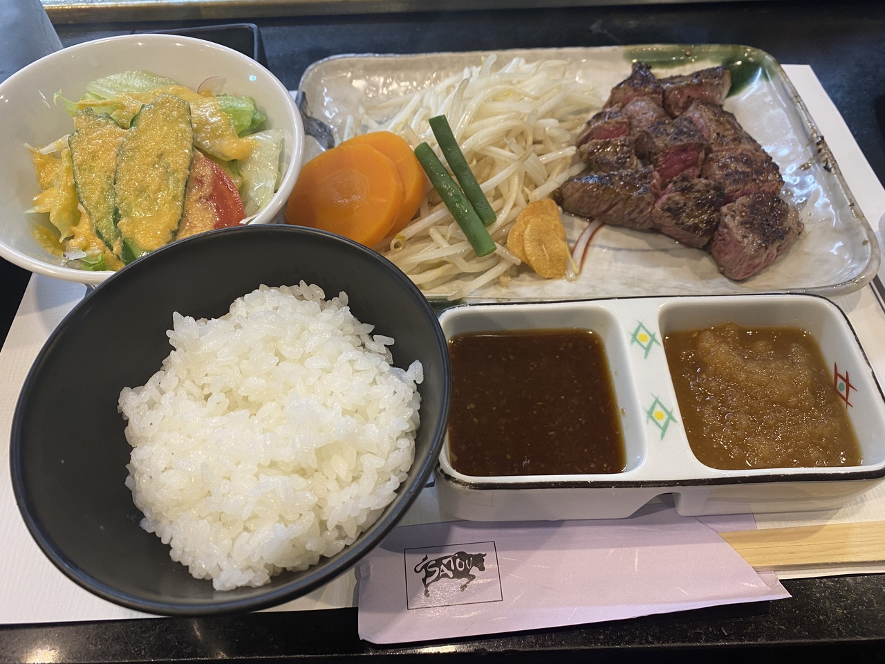 日曜のお昼に訪問。12時半のピークの為、約1時間並びました。吉祥寺のメンチカツさとうはご存じの通りで、来るたびに2階のレストランが気になっていました。本日は120グラム2,000円のさとうステーキを注文。お肉がミディアムレアでとても美味しい。量も少なすぎず丁度よい。カウンターに5席。テーブル席は10席ほどで、中に入れるのは5組程度。混んでいる理由が分かりました。ピーク時間を外すのがおすすめです。