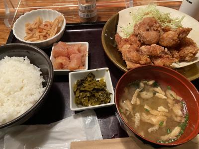 お昼時に丸の内へ寄る際は、よく利用します。久々に行ったらコロナ対策で机の上から食べ放題の明太子と高菜が無くなってて心配したけど、おかわりする際に追加でもらえる仕組みでした。ごはんですお腹いっぱいにしたい時は、がめ煮か魚の定食。この日は明太子唐揚げ1,300円を頂きました。安定の美味さです。