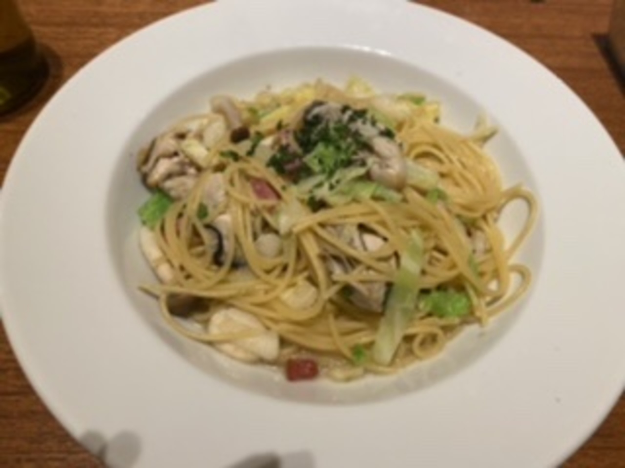 お昼をずらしてランチで訪問。牡蠣のペペロンチーノを注文しました。日比谷です1200円です牡蠣を入れるとなると仕方がないのかもしれませんが、量が少ないです。パンがあればいいのにな。味は悪くありませんが、残念です。