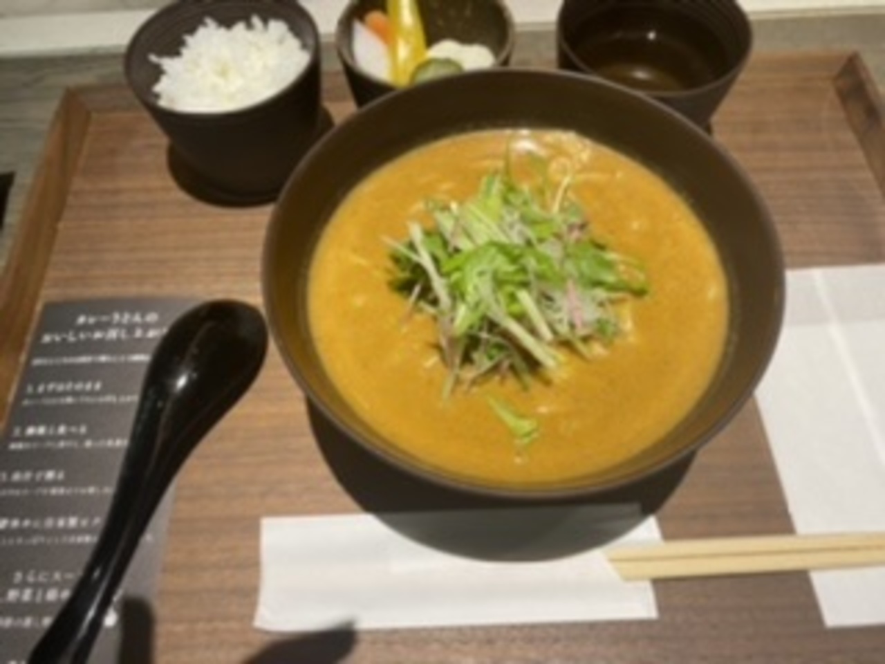 サクッとごはんしたくてカレーうどんをチョイス。おしゃれな店内に入ると、カウンターが何列もあって、ソーシャルディスタンスは合格。数分後、ピクルスと出汁とうどんが登場。まずは、オリジナルで食べる。その後、少し出汁入れてみました。薄めたほうた食べやすいかも。