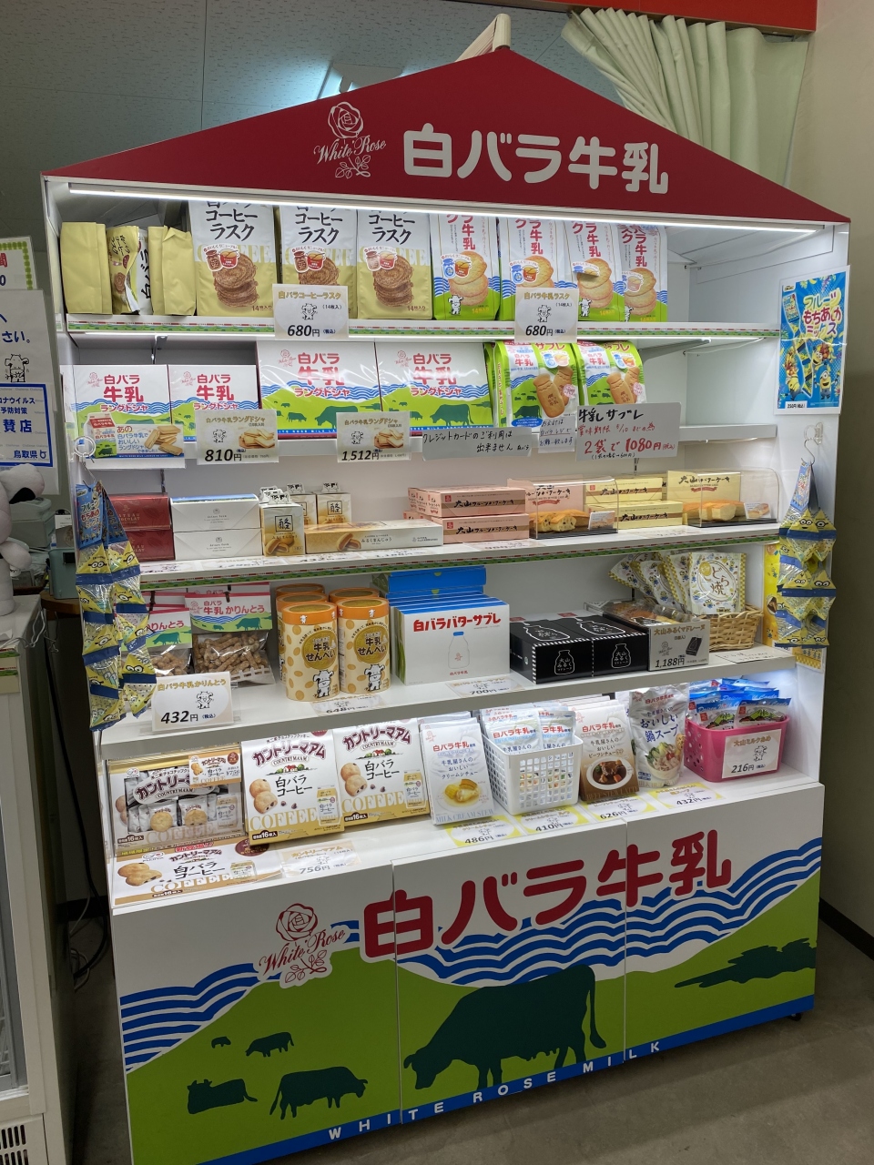 ジャスコ日吉津店へ来たなら、ぜひ寄ってほしいアスパル。JA鳥取西部が直営する農産物直売所なのですが、入り口付近に白バラショップはあります。私は白バラ牛乳のコーヒー牛乳LOVEなのですが、350円のソフトクリームも大好き。こっくりミルクの味がおすすめです。