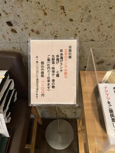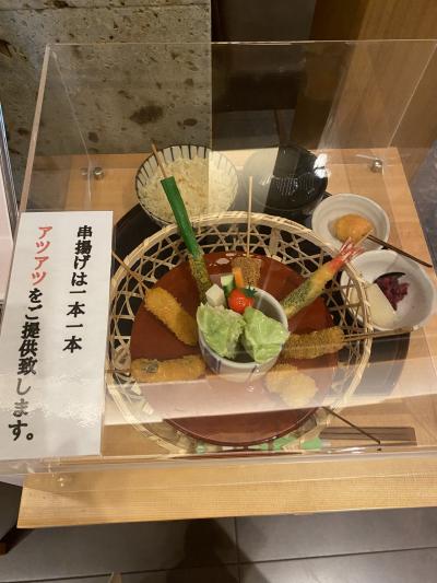 日比谷で映画を観る際に、ランチで訪問。時間をずらして平日の13時半にぶらりと訪れましたが、すぐに入れました。新宿三丁目はいつも混んでいると聞いていたので、こちらは比較的回転が良いかと。大きく3つのブースに分かれていますがすべてカウンターで目の前次々と揚げたてを頂きます。ランチは1,200円の7点盛りのみです。お肉、お魚、海老、モッツアレラチーズ、アスパラ、うずら卵、デザートのバナナまで最後まで楽しめました。