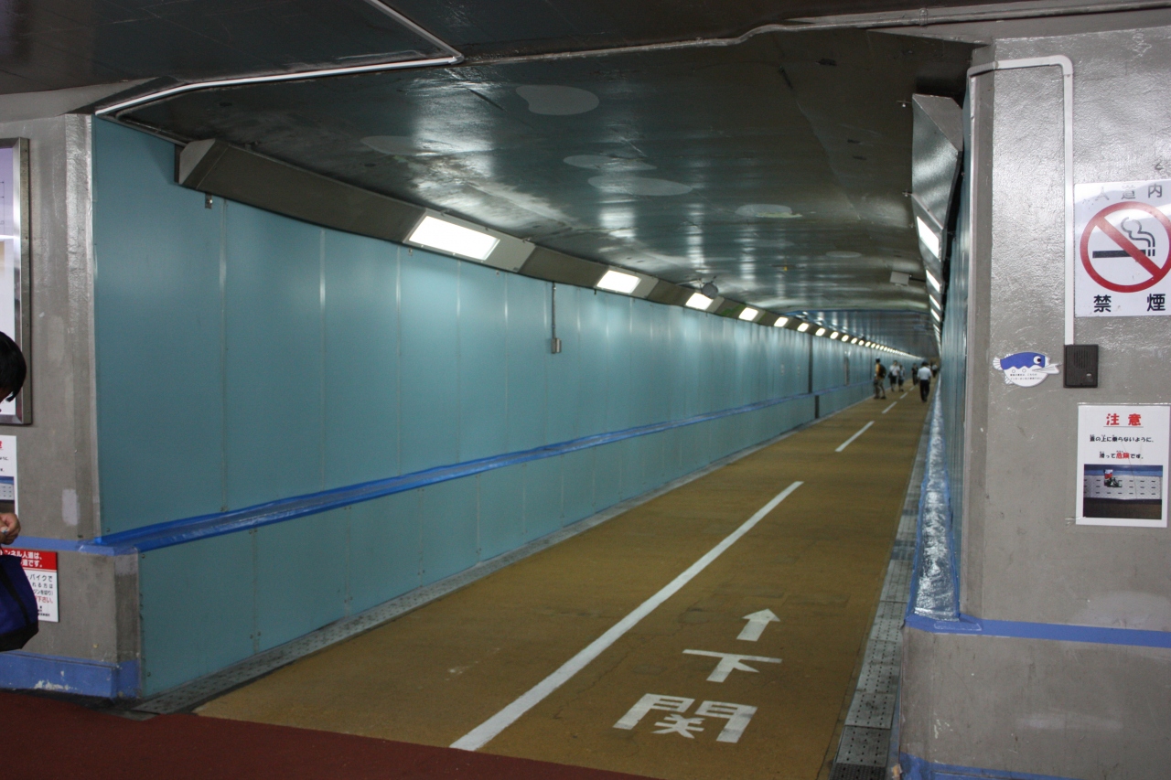 6分ほど歩くと山口と福岡の県境に、さらに5分ほど歩くと門司側のエレベーターに着きました。思ったよりも短かったです。