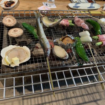 いろりに串をたてたり、網に乗せたりしてヤマメやイワナ、ひな鳥や牛、豚など、冬はイノシシやシカ肉も味わえます。焼くところから楽しめます。アワビの踊り焼きには 大人もこどもも大喜びです。