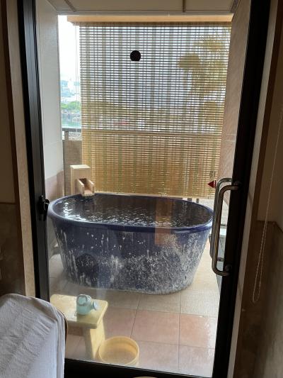 客室の露天風呂は 広くてゆったりしていて気持ちよかったです。しかも源泉かけ流し、24時間お湯があふれ出ていました。屋上には足湯や温泉プールもありました。電波が届かずWi-Fiもつながりにくいのですが、いっそスマホを手放して、チェックアウトの10時まで 温泉に浸るのもいいものです。