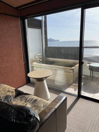 土肥温泉のさらにはずれ、小土肥海岸の目の前の一軒宿。夏はプライベートビーチ気分で海水浴ができるそうです。朝夕食共にお部屋食が選べるので、小さなお子さん連れにはありがたいです。部屋の露天風呂が源泉かけ流し、しかもオーシャンビュー。夕陽で金色に輝く海を眺めれば 日頃のストレスも吹き飛びます。大浴場にはハーブティやお水、フロントにはコーヒーのサービスがありました。