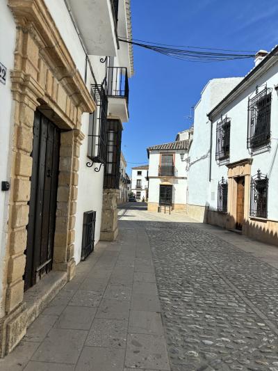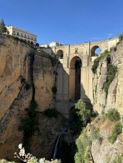 ロンダといったら、ヌエボ橋。さあ、いざ下から見上げようとしたら 当然降りていかなければなりません。石で作られた坂道や階段を延々と降りていきます。途中にあるのが、ヌエボ橋解説センターです。有料ですが、ここでヘルメットを借りて、きれいな階段を降りると、すぐ橋のふもとにいけます。以前は橋をくぐることができたようですが、今はできません。残念ですが、それでも上を見上げると おお~あのヌエボ橋!感動します。そして展望台からは渓流やふもとの村、遠くの山々を見渡せます。比較的楽に見学できます。もしそこを利用しないとなると、少し不安定な坂道と石段を更にさらに降りてゆきます。橋からは少し離れたところにつきますが、そこからの眺めはまた素晴らしい。私は両方経験してへとへとになりました。どちらか一つでも十分かとは思いますが、へとへとも感動のうちです。