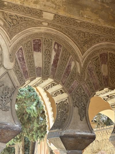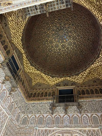 日によって、でしょうがお昼前後に当日分のチケットが売り切れてしまうことがあります。念のため、前日までの予約をお勧めします。スマホでの予約は、スクリーンショットでは受け付けてもらえませんのでご注意ください。さて、アルカサル、イスラム時代の宮殿の跡地に、カスティーリャ王ペドロ1世がイスラム職人を集めて ムデハル様式で建設したものだそうです。その後増改築され、ゴシックやルネサンスなどの様式が混ざっています。複雑なつくりで 出口がわからなくなりました。そして、庭園がとにかく広い!トータルで 2時間くらいで回れますが、庭園でゆっくり過ごすのも楽しいです。ちなみに5月の午後3時の気温は42度! アルカサルの中はそれほど熱くは感じませんでした。