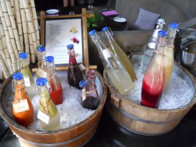 朝食のジュースは印象的。専用のボトルでさまざまな生ジュースが供され、毎朝迷っていました。