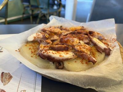 ここではコロッケと生ハムマリネと豚肉の炒め物とイカの炭火焼、タコのポテト添えを食べました。