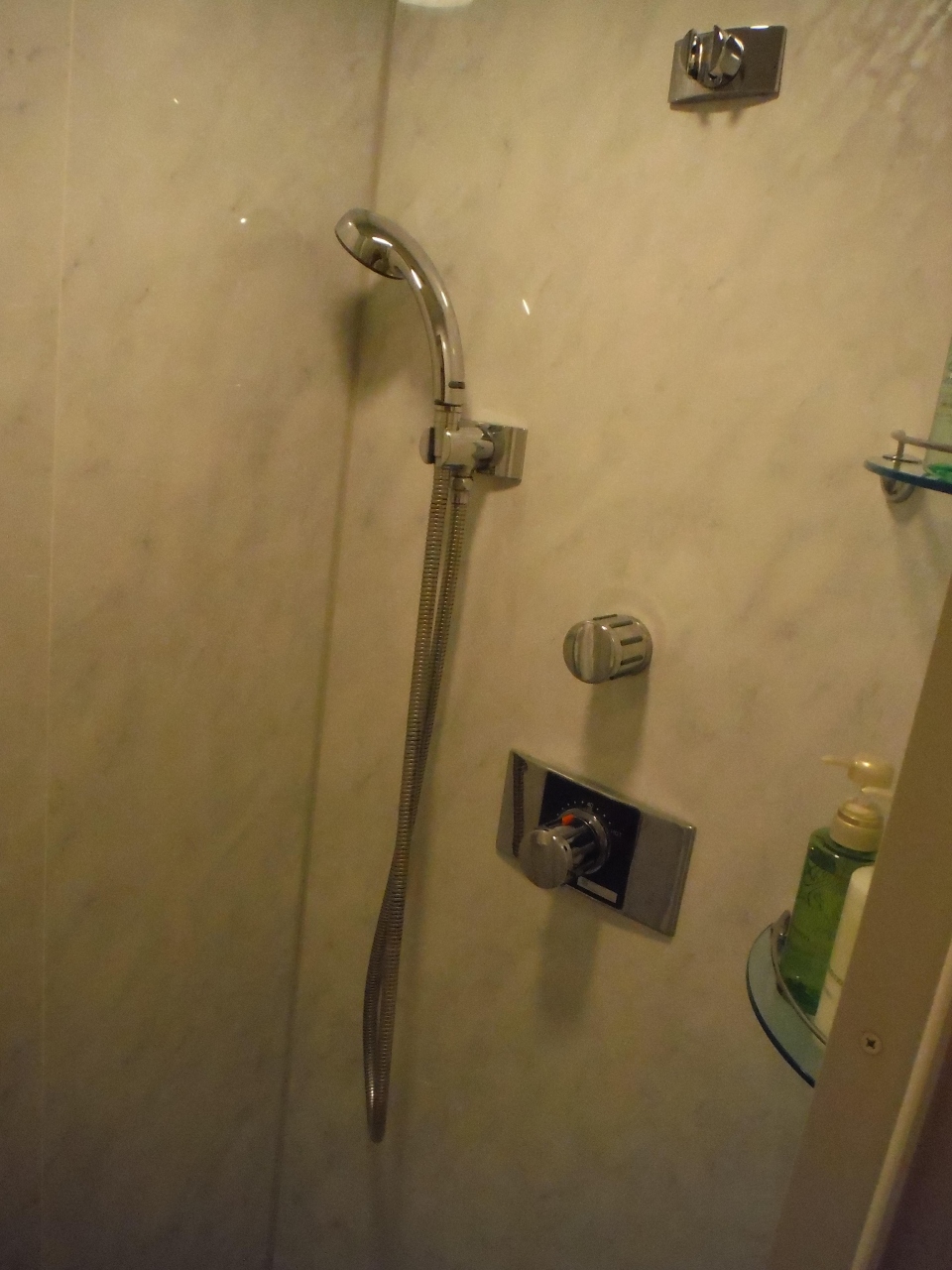 バスルームは浴槽はなく、シャワーのみ。お湯の勢いは日本と同じくらい。お湯もキチンと出ます。ただ、シャワー室と洗面所の床の高さが同じであるため、勢いよく出している時間が長くなると大量の湯が洗面所まで流れ込んでしまうので、結構ドキドキしながらシャワーを浴びていた。