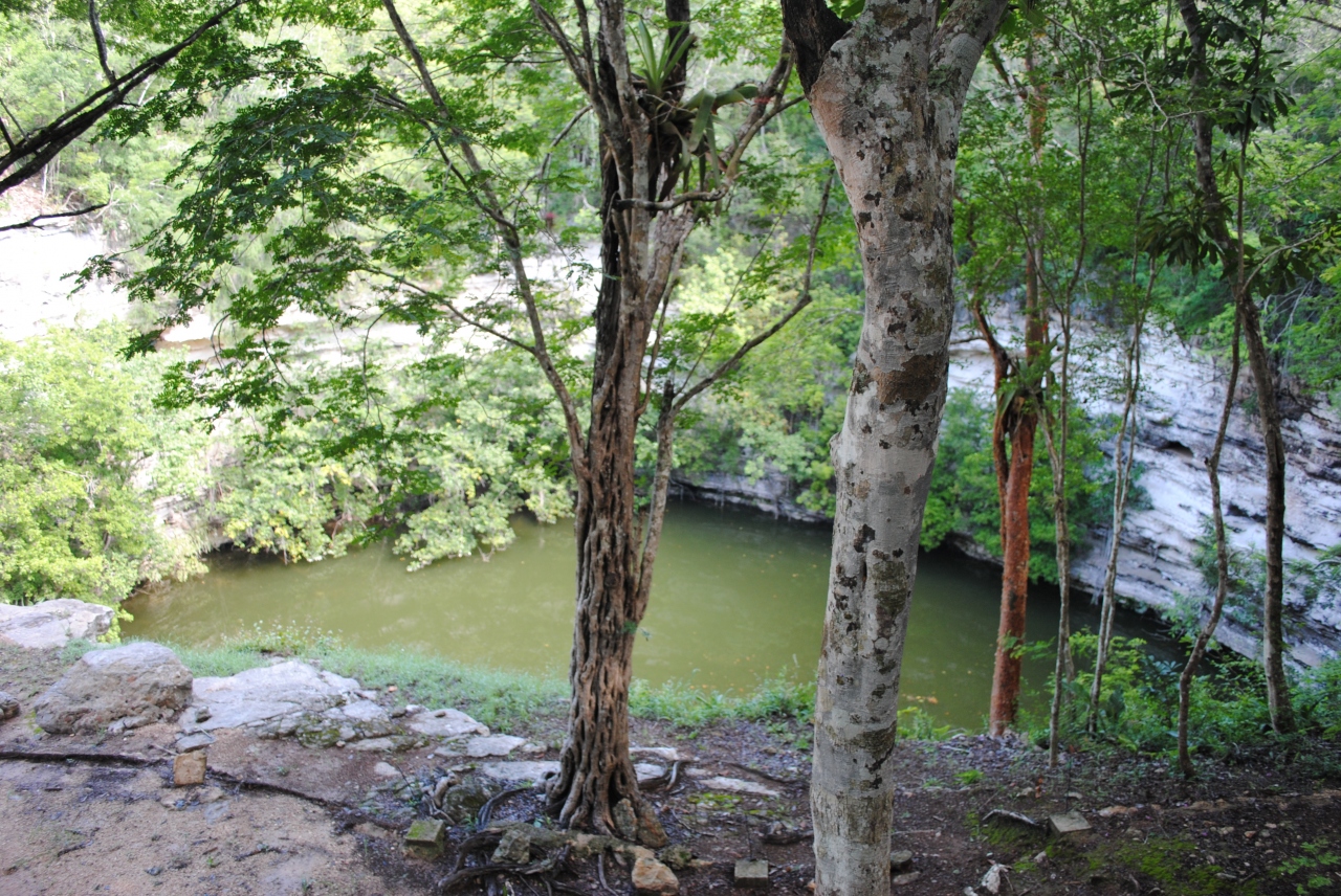 セノーテと言えば一般的に透明度が高いキレイな泉と言うイメージが強いが、ここはアオコが浮いていて透明度はほぼゼロ。