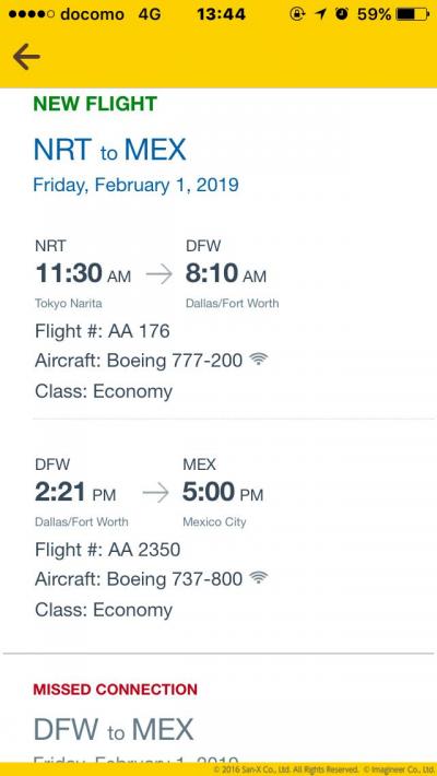 降機してしばらく歩くと航空券が発券されている状態で日本語話す人が呼んでいたが、メキシコシティ行きの航空券がなかったので、ひとまずチェックインカウンターに行った。